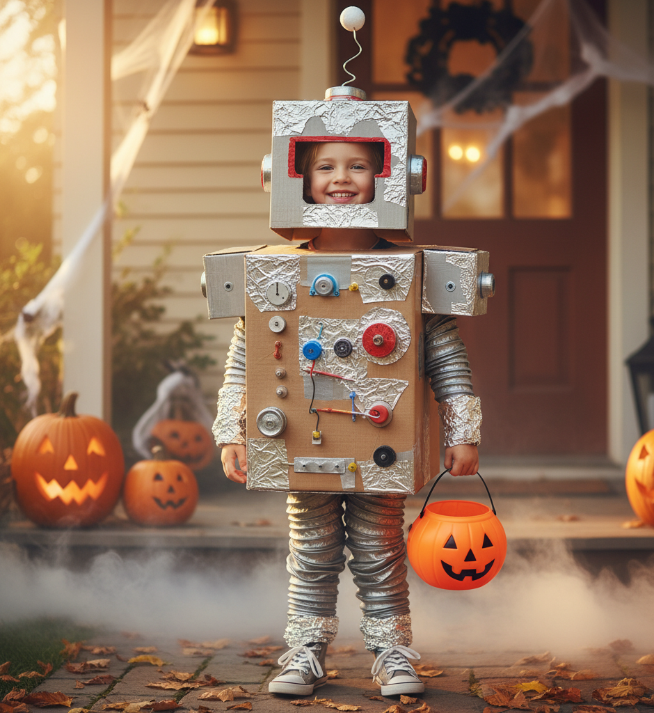 - Robot: Paint a large box silver or metallic, cut out armholes and eyeholes, and decorate with aluminum foil, bottle caps, and old wires. Add a smaller box for the head. It’s a classic and charming homemade robot costume.